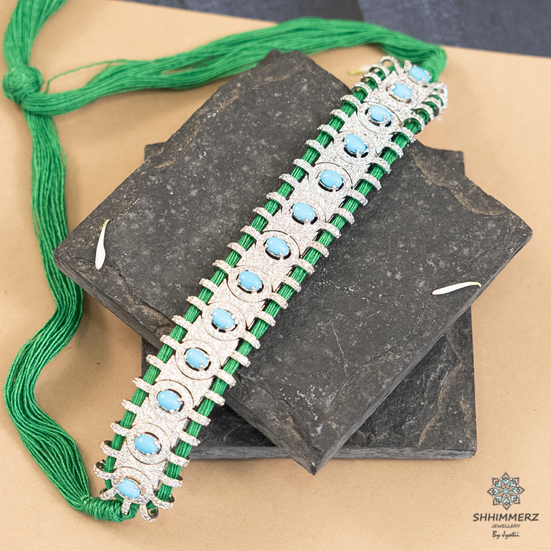 Stylish blue thread neckpiece featuring a captivating blue stone at the center. This handcrafted piece radiates elegance and charm, adding a touch of color to any outfit. Perfect for casual or festive wear, the blue-on-blue combination creates a chic and contemporary look in costume jewellery.