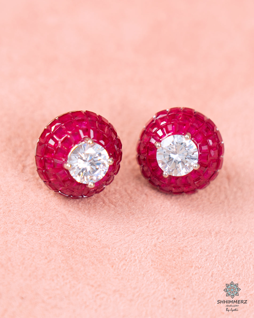 Round red stone earrings crafted in diamond custom jewellery. The radiant red centre stone is surrounded by sparkling diamonds, creating a timeless and elegant look. Perfect for festive occasions or evening wear, these earrings add a touch of luxury and sophistication to any outfit.