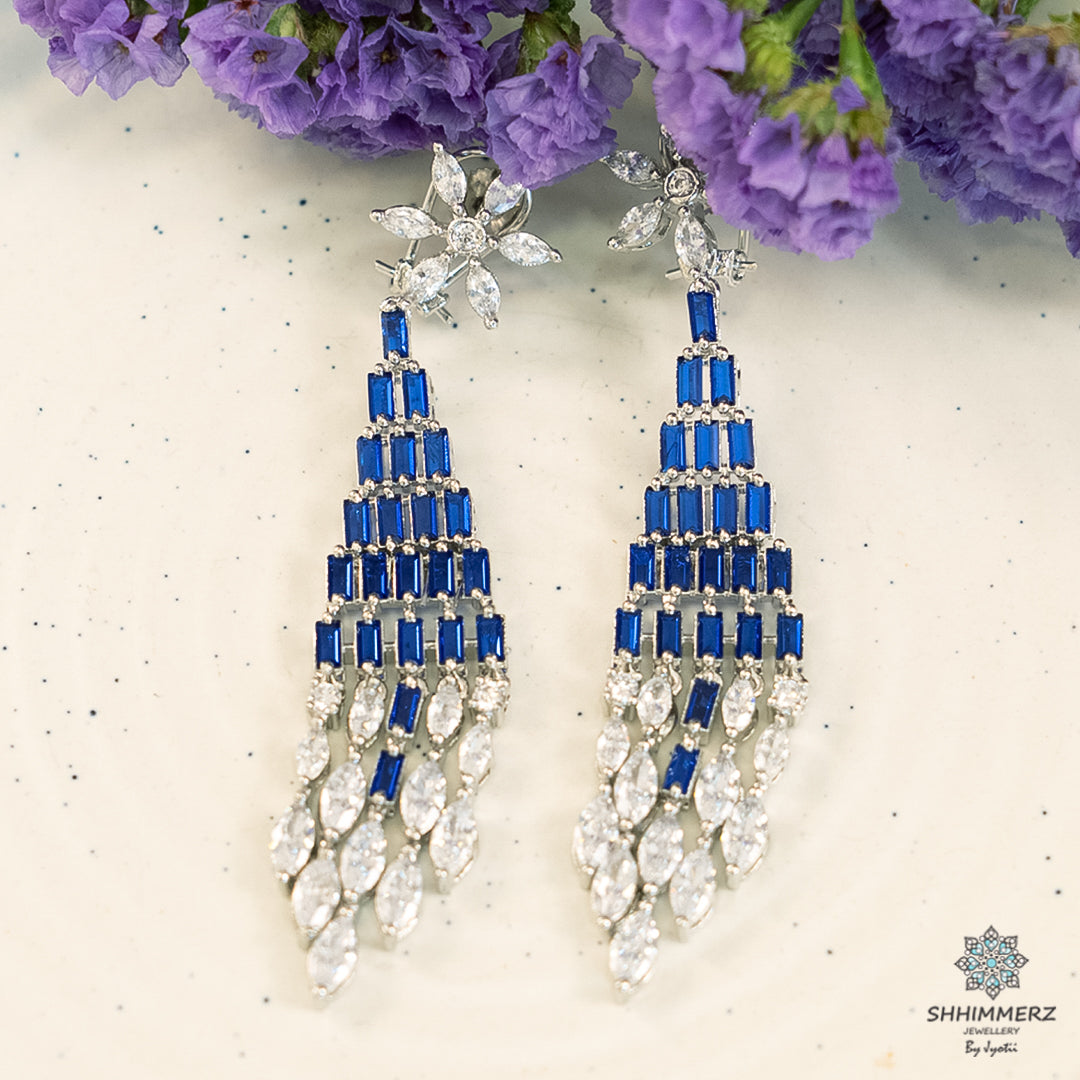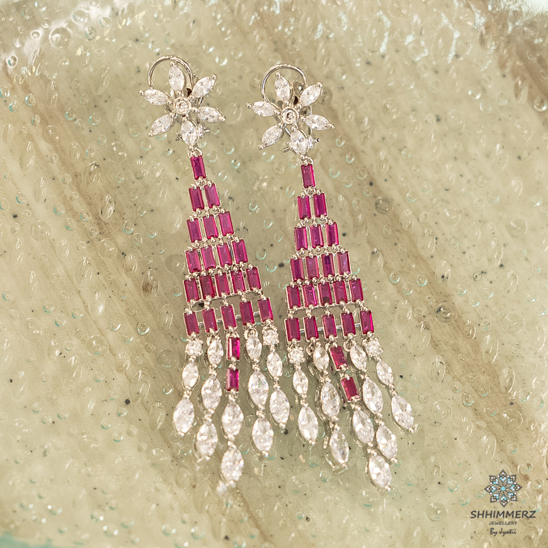 These earrings feature a glamorous and elegant design. At the top, a delicate floral motif with sparkling white stones serves as the stud. Hanging below, a cascading pyramid of rectangular pink stones leads to shimmering marquise-cut white stones, creating a graceful, chandelier-like effect. Perfect for festive occasions or evening wear, these earrings combine vibrant colour with timeless sparkle, exuding luxury and sophistication.