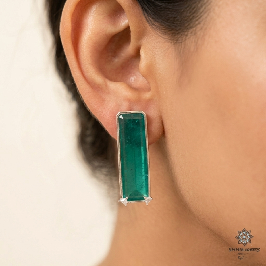 Emerald rectangle earrings feature sleek, geometric designs with vibrant green stones, offering a sophisticated and modern touch to any look.