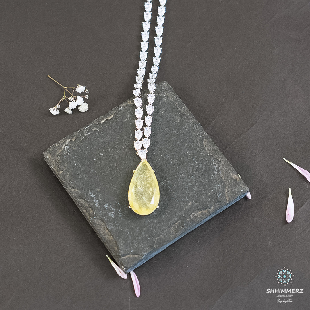 A luxurious diamond long chain featuring a bold big drop pendant, crafted in elegant silver polish. Accented with sparkling stones, this statement pendant set adds graceful movement and timeless glamour, making it perfect for weddings, festive occasions, and elevated ethnic or fusion looks.